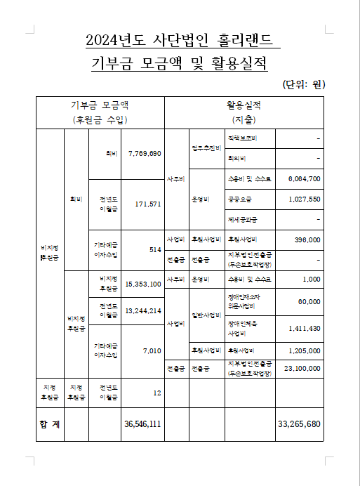 운영법인 사단법인 홀리랜드 2024년 기부금 모금액 및 활용실적 페이지 정보 작성자 최고관리자 작성일25-07-02 14:09 조회66회 관련링크 본문 운영법인 사단법인 홀리랜드 2024년 기부금 모금액 및 활용실적 목록 답변 이전글2025년 6월 업무추진비 집행내역 25.07.02 다음글운영법인 사단법인홀리랜드 2024년 결산 공시(2) 25.07.02