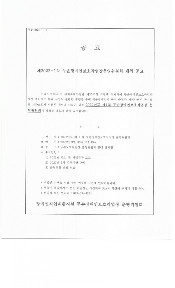 제2022-1차 두손장애인보호작업장 운영위원회 개최 공고 페이지 정보 작성자 최고관리자 작성일22-03-24 14:52 조회264회 관련링크 본문 제2022-1차 두손장애인보호작업장 운영위원회를 개최합니다. 목록 답변 이전글두손장애인보호작업장 2021년 세입 세출 결산서 공개 22.04.20 다음글두손장애인보호작업장 2022년도 본예산 공개 22.01.19
