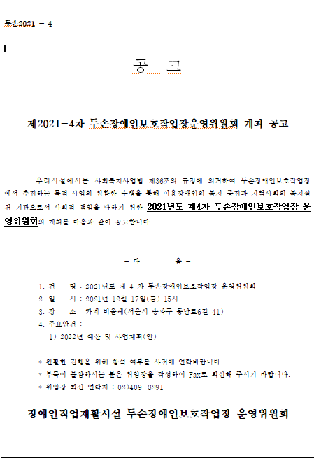 제2021-4차 두손장애인보호작업장 운영위원회 개최 공고 페이지 정보 작성자 최고관리자 작성일21-12-10 13:47 조회347회 관련링크 본문 제2021-4차 두손장애인보호작업장 운영위원회를 개최합니다. 목록 답변 이전글두손장애인보호작업장 2021년도 제3차 추경예산 공개 22.01.19 다음글두손장애인보호작업장 2021년도 제2차 추경예산 공개 21.11.08
